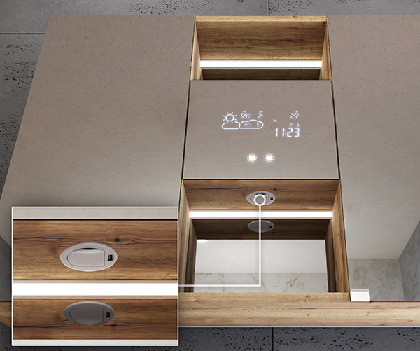 A modern termékeknek modern megoldásokra van szükségük. Emiatt a terméked olyan kiegészítő eszközökkel szerelhető fel, mint pl. elektromos dugaszoló aljzat beépített USB porttal. Csatlakoztathatod a hajszárítót vagy feltöltheted az elektromos fogkefét.